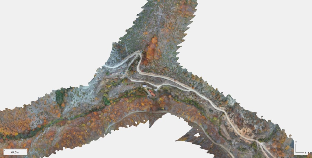 Ο νερόμυλος βρίσκεται στην συμβολή 2 ρεμάτων, οπότε και πραγματοποιήθηκαν 3 πτήσεις με το drone, μία για το ανατολικό ρέμα, μια για το βόρειο ρέμα και μια για το νότιο ρέμα μετά τη συμβολή των δυο παραπάνω ρεμάτων στον νερόμυλο.